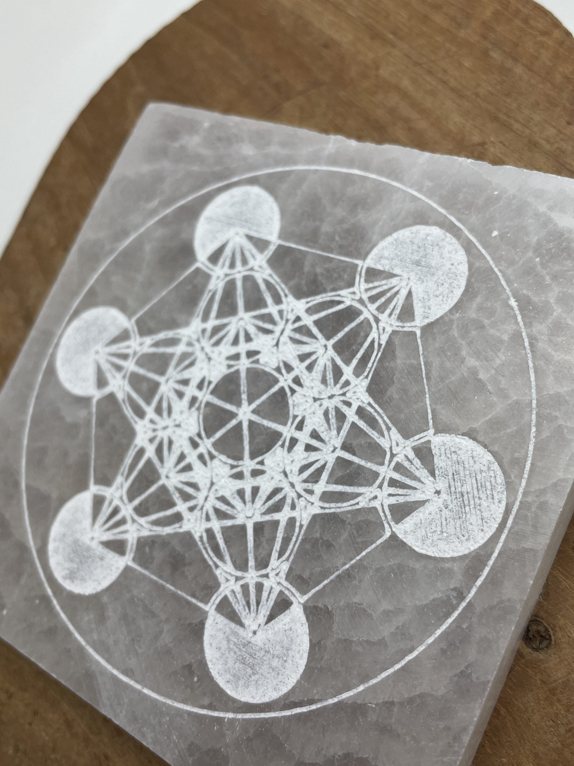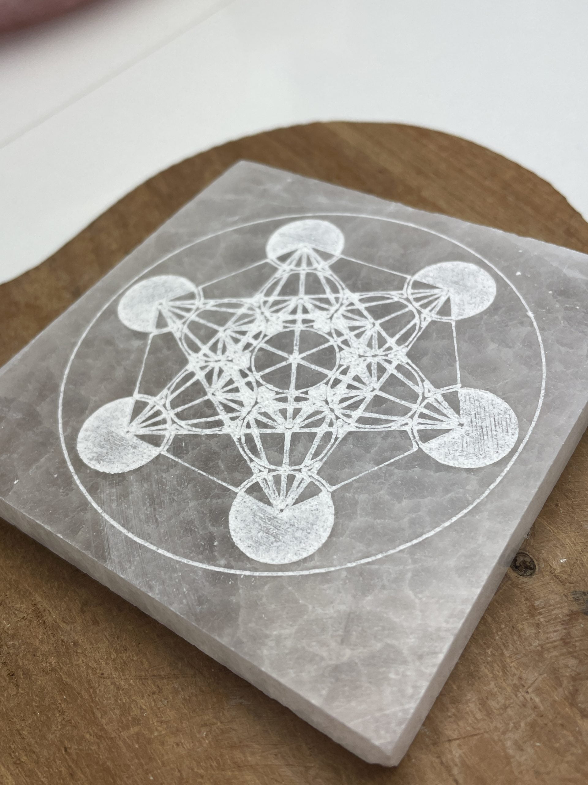 Plaque en sélénite décoré d’un motif cube de métatron gravé dessus. 9cm x 9cm